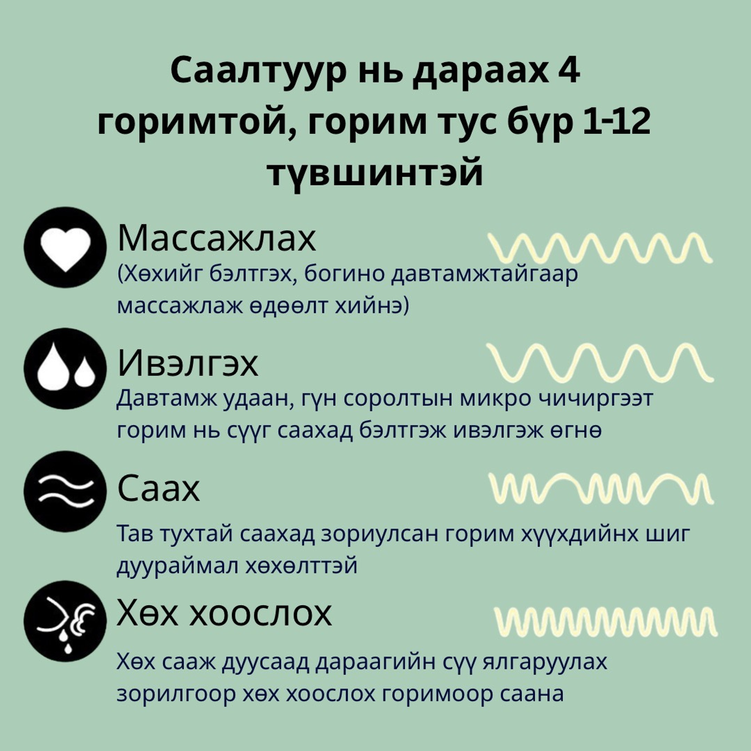- Ажиллах 4 горимтой: Массажлах, Ивэлгэх, Саах, Хөх хоослох